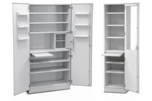 Одностворчатый шкаф предназначен для хранения медикаментов, лекарственных препаратов, инструмента, перевязочных материалов в больничных отделениях, поликлиниках, медицинских пунктах, аптеках. Пространство шкафа разделено на верхний и нижний отсеки фиксированной полкой, под которой закреплен дополнительный выдвижной столик.